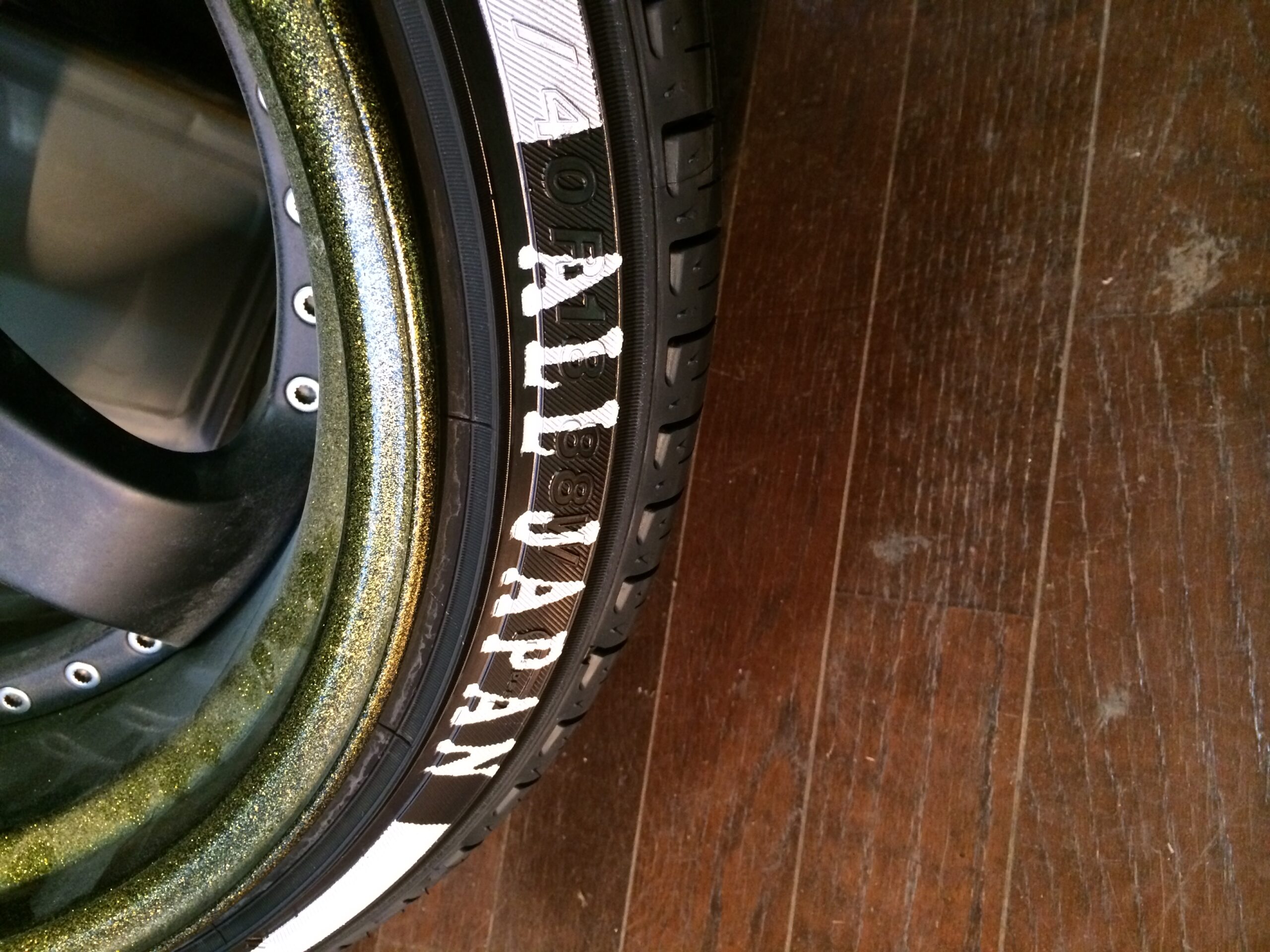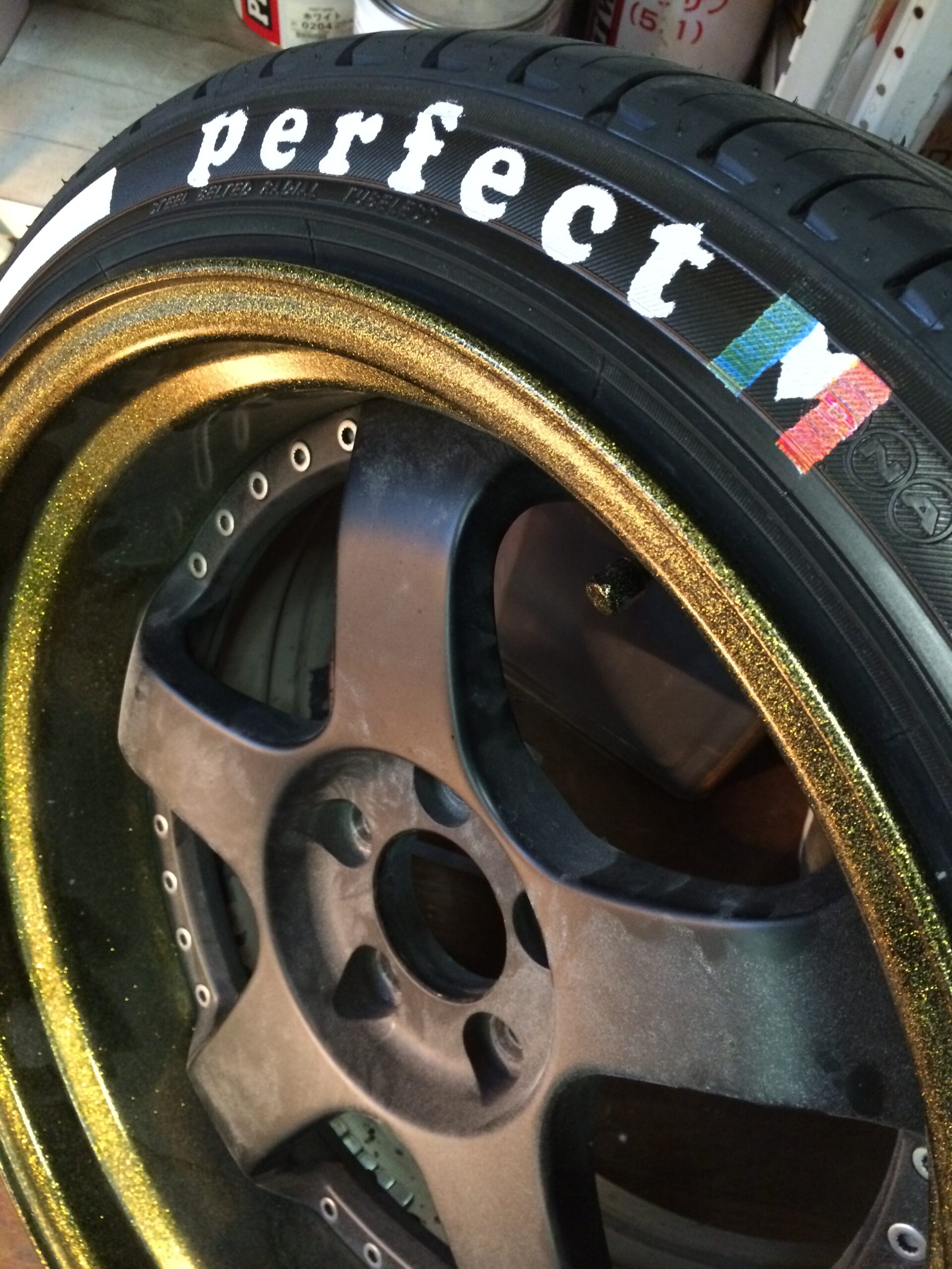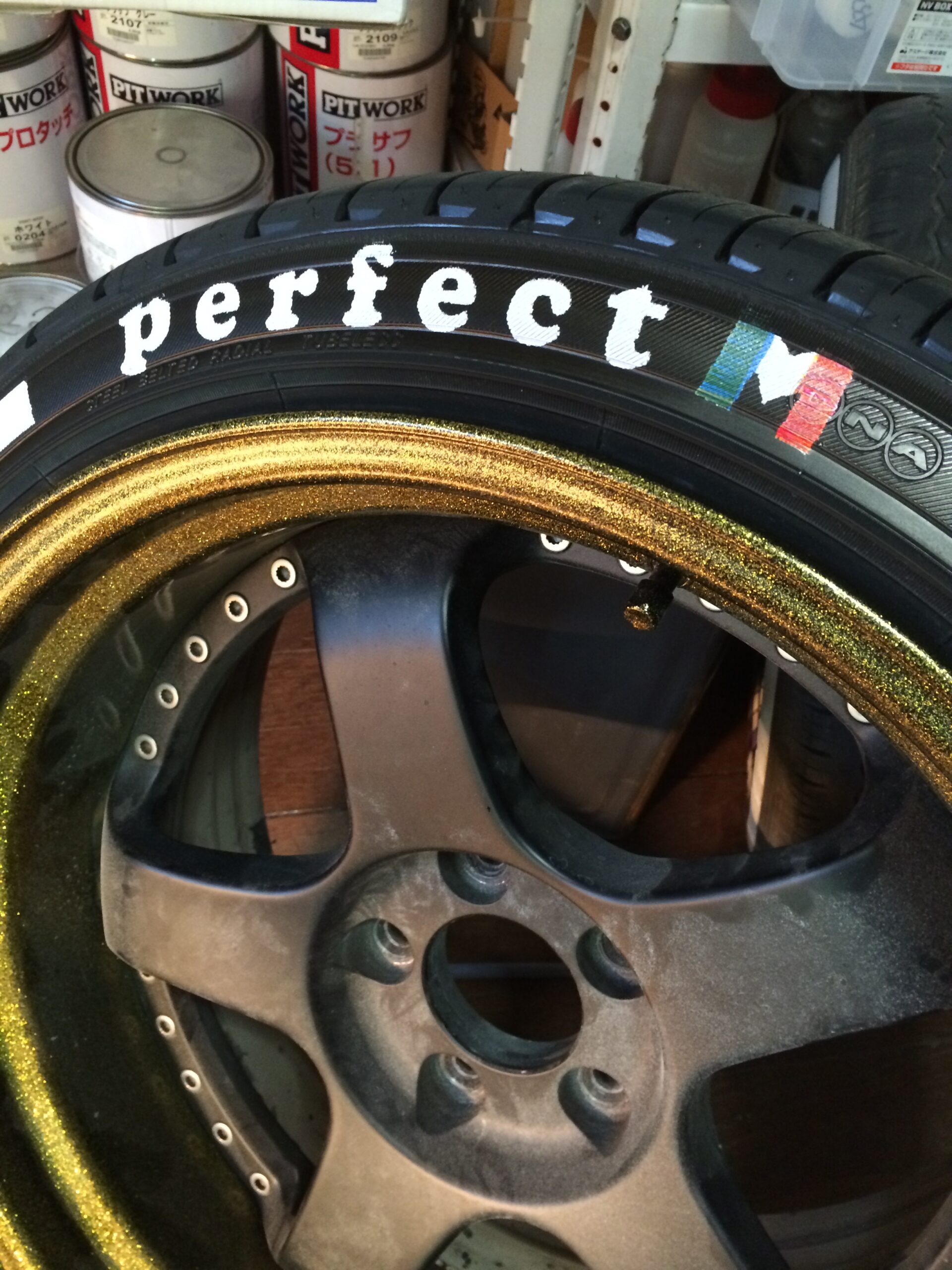 ホワイトリボンに文字フォントはお客様のカークラブのフォントに合わせました。最後のMはイタリアカラーにしたいということで三色に色分けしプリント致しました。すごい改造されているお車なのでタイヤプリントがさりげなく見えます。