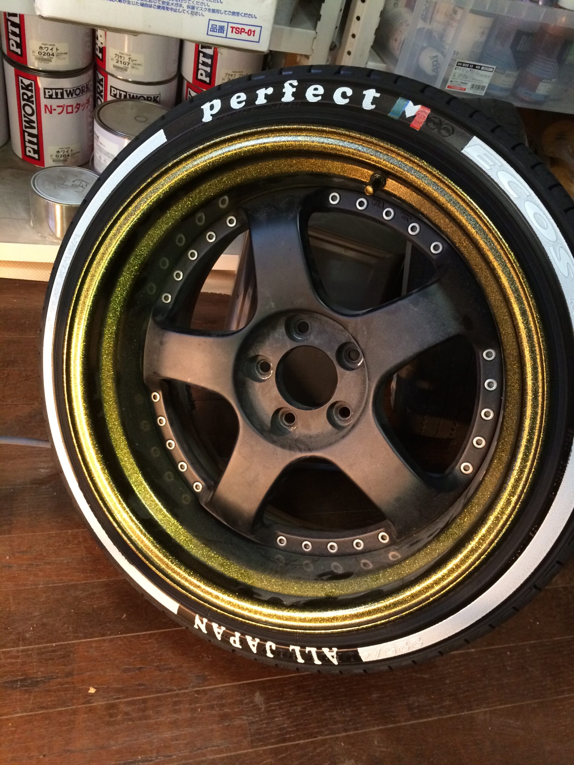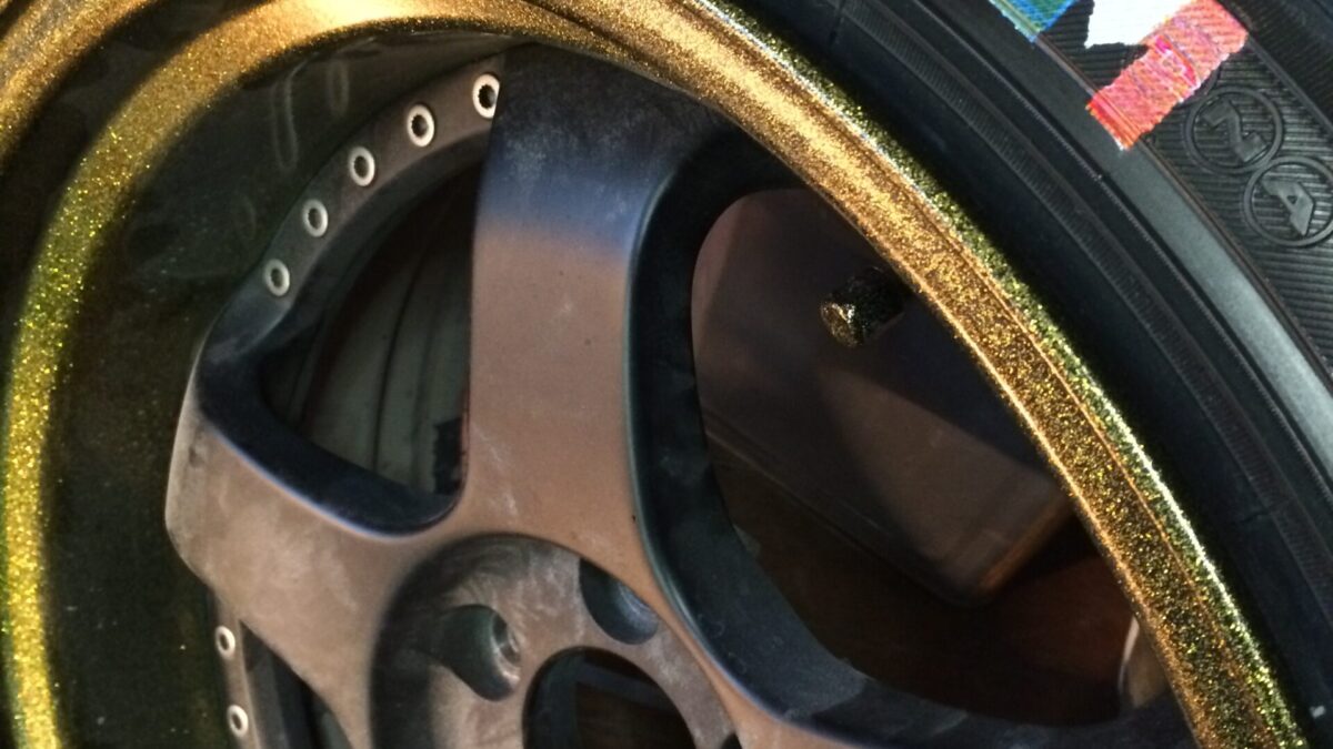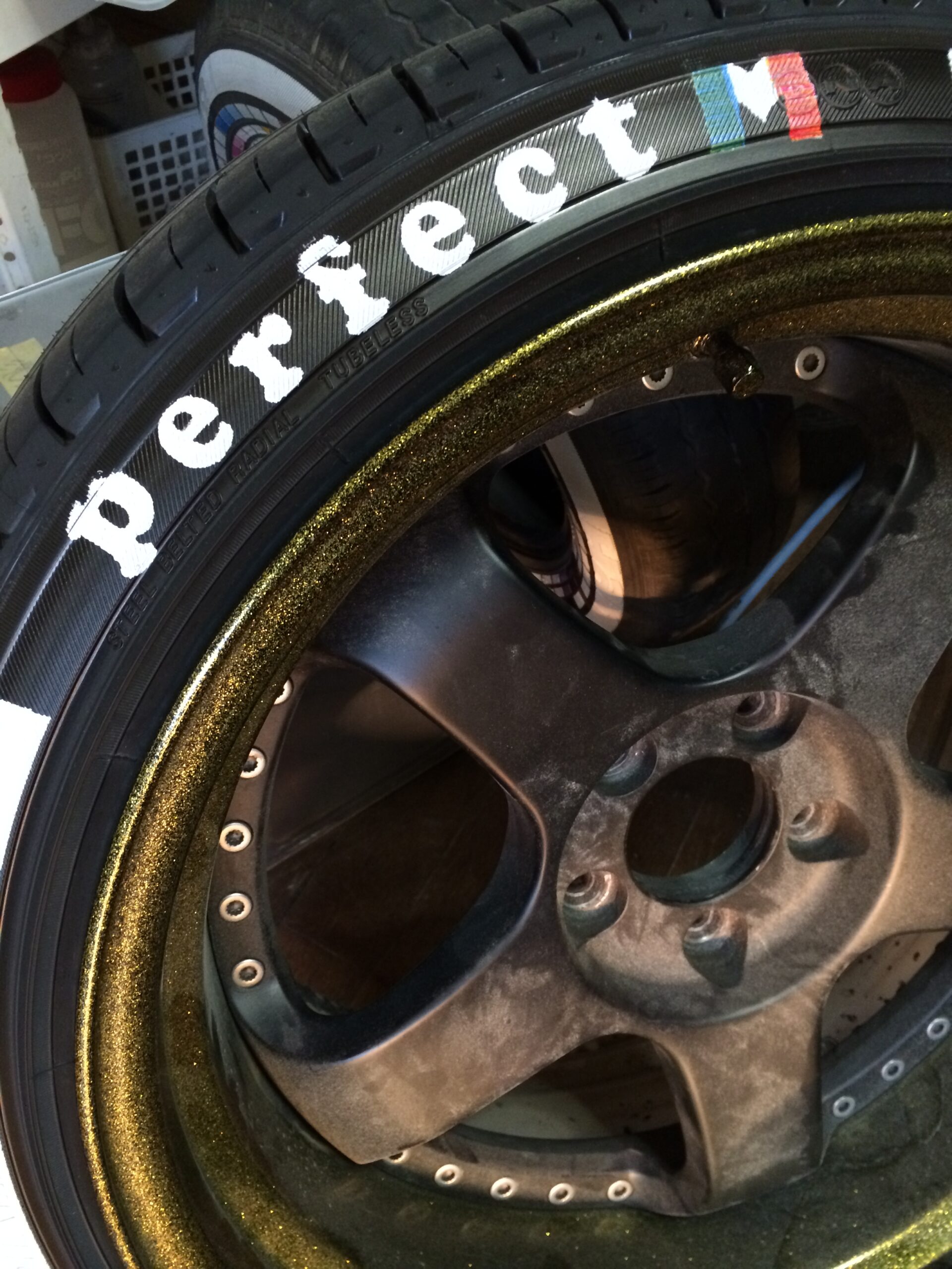 ホワイトリボンに文字フォントはお客様のカークラブのフォントに合わせました。最後のMはイタリアカラーにしたいということで三色に色分けしプリント致しました。すごい改造されているお車なのでタイヤプリントがさりげなく見えます。